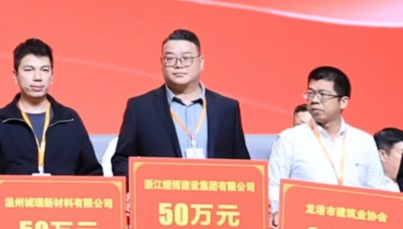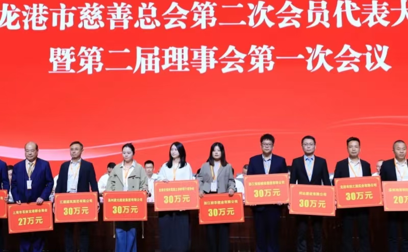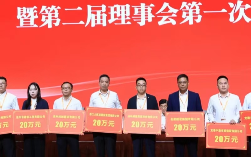 大会颁发了荣誉会长、副会长聘书,并举行了慈善募捐仪式,共有86家企业代表参与捐赠,现场募集善款6000余万元。会上,龙港市18家建筑业企业共捐资322万,其中煜博建设集团捐资50万、祥达建设30万、温州建元建设集团30万、汇建建筑集团30万、浙江恒瑜建设集团30万、温州尚城建设20万、龙港中浩市政建设20万、温州城建集团市政有限公司20万、金厦建设集团20万、浙江大瓯港建设集团20万、温州市建筑工程有限公司20万、旗舰集团10万,浙江集泰建设、浙江笙柏建设、浙江戎业工程建设、温州东江建设、温州建源建设、温州鸿致建设等6家共捐22万。
