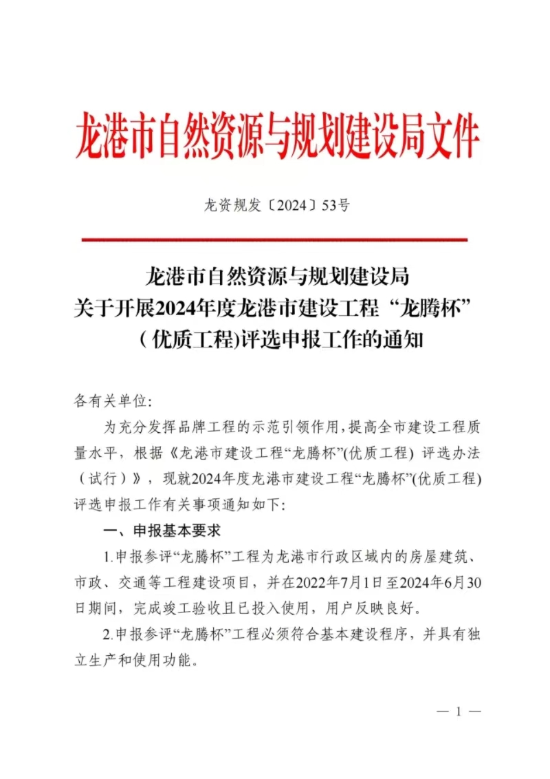 关于开展2024年度龙港市建设工程“龙腾杯”(优质工程)评选申报工作的通知